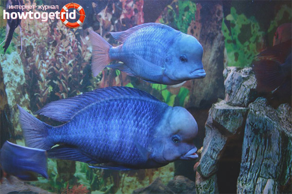 Blue dolphin (Cyrtocara moorii) should be attributed to aquarium cichlids. It came from the African lake of Malawi. Its popularity is mainly due to the color and unusual shape of the body, on which there is a large fat cone. It is very difficult to call this representative very small, since he can grow in length in captivity up to 25 cm. Sometimes sizes can also take on large sizes. The fish are peaceful, but the males are quite aggressive and often engage in fights between themselves.