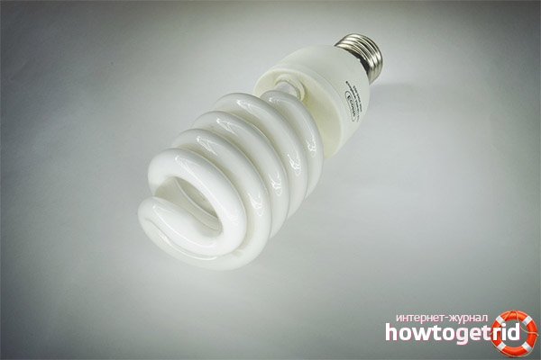 An energy-saving lamp is an analogue of lamps installed in offices, which are called "fluorescent tubes." In fact, this is exactly the same tube, which is made in the form of a spiral or a snake, having a pair of mercury inside. On the outside, the tube is treated with a phosphor. Under the influence of electric discharges, mercury vapors intensively emit UV rays. This leads to the emission of light by the phosphor. Inside the base of such a lamp is electronic ballasts (or, briefly, electronic ballasts), due to which such a lamp is launched.