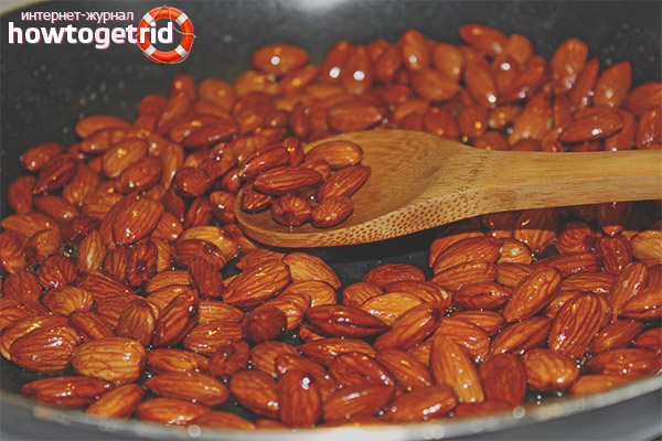 However, there are recipes for frying almonds in oil that you can try. To get a spicy salty snack, which perfectly saturates the body, you can fry almonds with spices. To do this, you need to heat 0.5 tbsp in a pan. vegetable oil, add 0.5 tsp. iodized salt and spices - 0.5 tsp turmeric, a little coriander, caraway seeds, allspice and other seasonings to taste. The kernels are fried in oil for about 5 minutes, mixing thoroughly.
