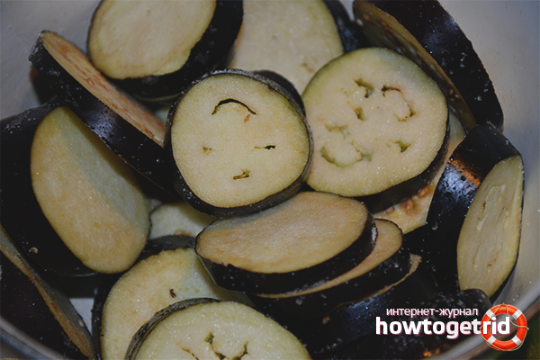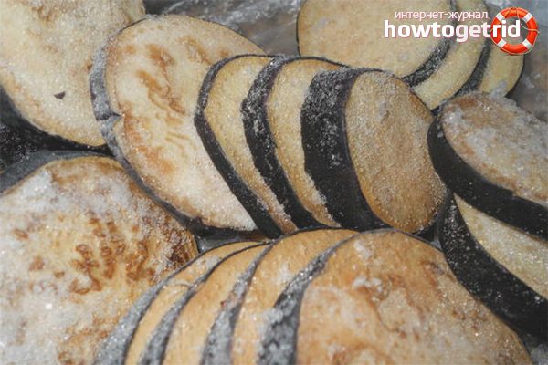 For all methods, you will need to cut the eggplant in a convenient way. For stew - in cubes, for pizza - in rings, for hot salad - in straws. The next step is to remove the bitterness. Either pour salt in a bowl for 20 minutes or pour cold salt water in a saucepan for the same time. Bitter liquid is poured; it is unsuitable for further use.