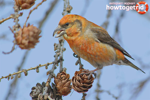 - The main product in the diet of the considered individuals are spruce cones. Due to the peculiar shape of the beak, these birds remove flakes from the cones without any problems. Next, the seeds peck out the seeds. It is worth noting that literally a couple of grains is enough for her to eat birds.