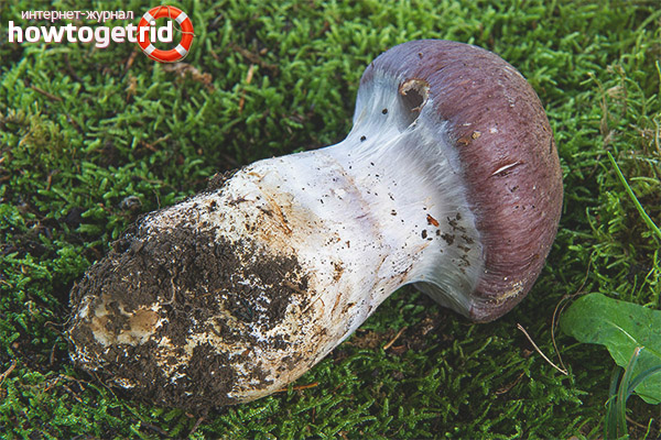 - The length of the leg of mushrooms in height can reach up to 14 cm. Moreover, their thickness does not exceed 5 cm. If you look closely at the base, you can see the thickening in the form of a tuber. On the very surface of the legs, the remains of the bedspread are visible. In young immature fruiting bodies, the leg has a pale purple color.