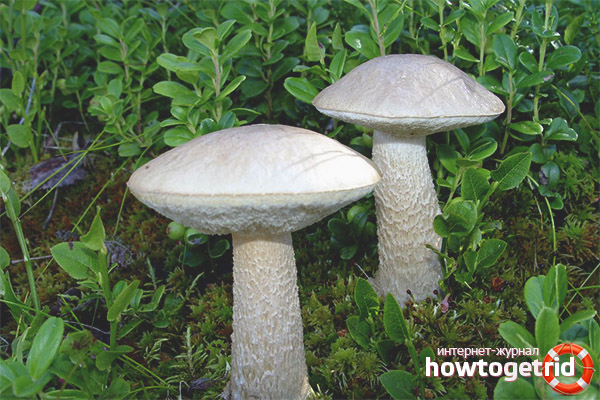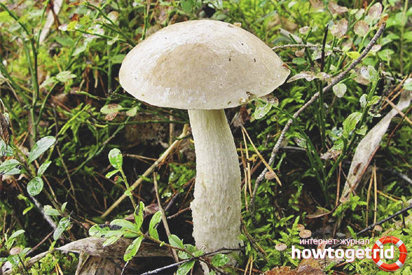 White boletus - another porcini mushroom very similar to boletus, differs in the color of the pulp markedly changed at the break point. White boletus or white aspen is a fungus that has a fairly large size. It is also distinguished by the presence of a meaty hat, the circumference of which sometimes reaches 25 centimeters in diameter. The hat is painted white, gray-white or gray. The pulp is strong, acquires a blue or green hue to the bottom, at the fracture it is usually bluish, and sometimes it even reaches a deep black color. The leg is high, the bottom is much thicker than the top. It has a white color, along the entire length, longitudinal or white scales with a brownish tint are necessarily located.