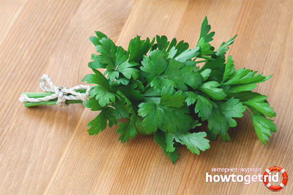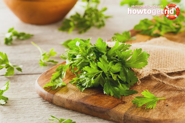- Low calorie content and, at the same time, the accumulation of useful elements allows you to use parsley in the menu of losing weight and obese people. As a result, cholesterol levels are reduced, and the risk of developing atherosclerosis is prevented.
