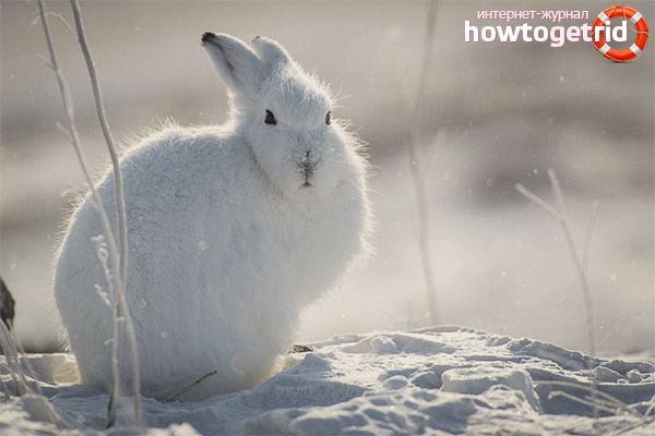 The color of the hare changes with the changing season, the hair in summer is gray, sometimes with a shade of red. And in winter - snow-white, with barely noticeable dark spots on the ears. The hare sheds twice a year, this process depends on the temperature conditions in the habitat. In areas where snowfall is much less, the color of the animal remains grayish.