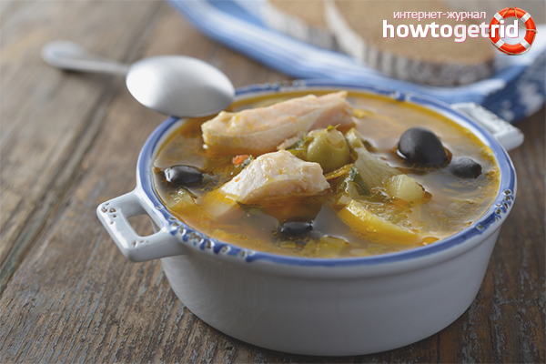 - Laisser mijoter la soupe entre moyenne et basse pendant un quart d'heure. 5 minutes avant la fin du processus, entrez les olives ou les olives, divisées en 2 moitiés. Au moment de servir, saupoudrer d'aneth haché et d'une tranche de citron.