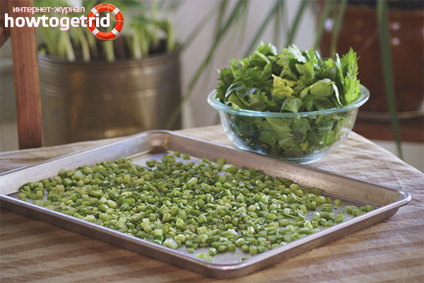 Le céleri en céramique peut être séché avec des brindilles ou des feuilles, ou haché. Pour ce faire, l'herbe doit être triée, à l'exclusion des feuilles flasques et jaunies. Après cela, le céleri est lavé à l'eau froide. Il est préférable de verser du liquide dans un bol plutôt que d'utiliser de l'eau courante, de sorte que toute la surface des rameaux bouclés sera lavée. Ensuite, le paquet est étalé sur des serviettes en papier et laissé absorber l'excès d'humidité. Si vous décidez de hacher les feuilles de céleri pour la récolte - hachez les feuilles avec un couteau en assez grandes parties.
