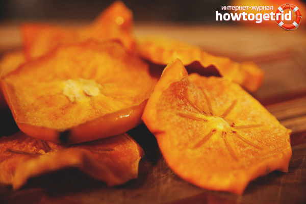 - Retirer le zeste des kakis, couper en tranches et mettre au four pendant 40 minutes, cuire à une température de 50 degrés. Faites attention à l'état des pièces, elles doivent rester légères. La présence de plaque blanche indique une teneur élevée en sucre dans le fruit. Cette opération vous permet d'économiser des kakis jusqu'à 90 jours.